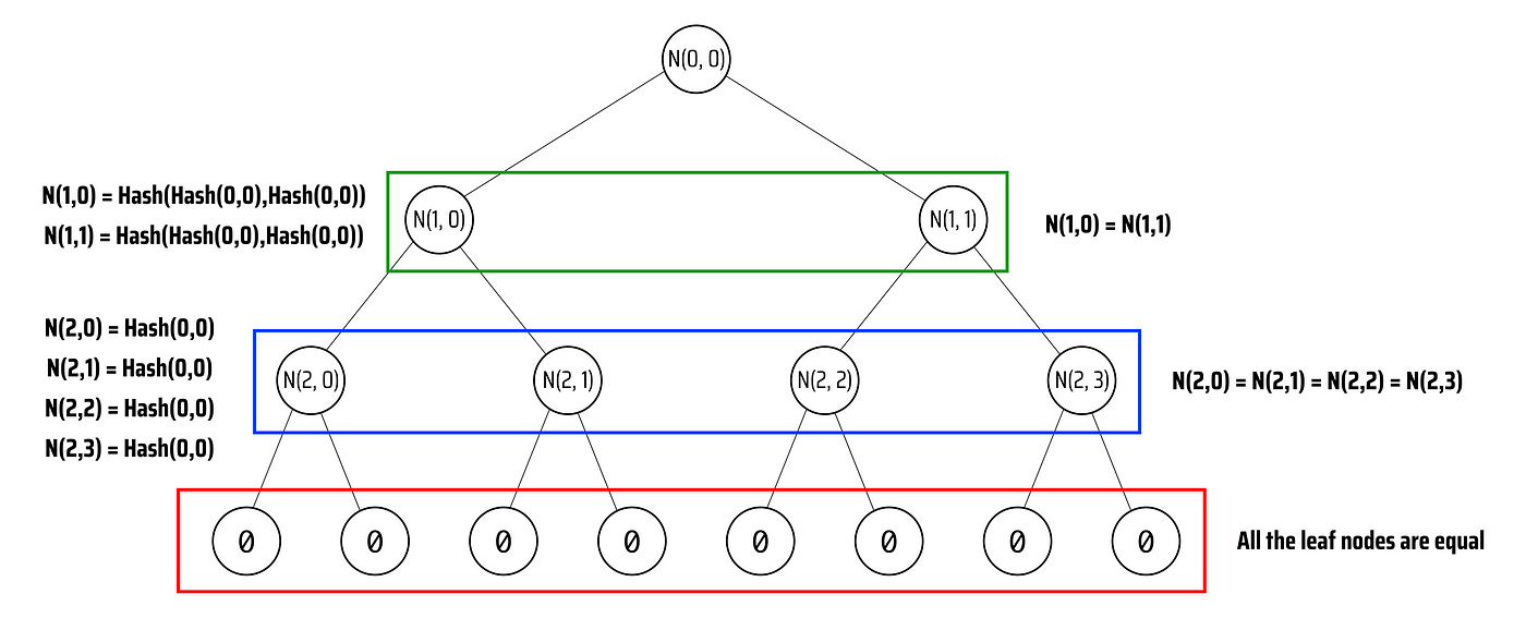Aha! When a merkle tree is empty, it looks like the all the nodes on each level have the same value . The value of the nodes on each level of an empty merkle tree are known as the Zero Hashes and are often denoted as Zₙ where n = TreeHeight - Level .