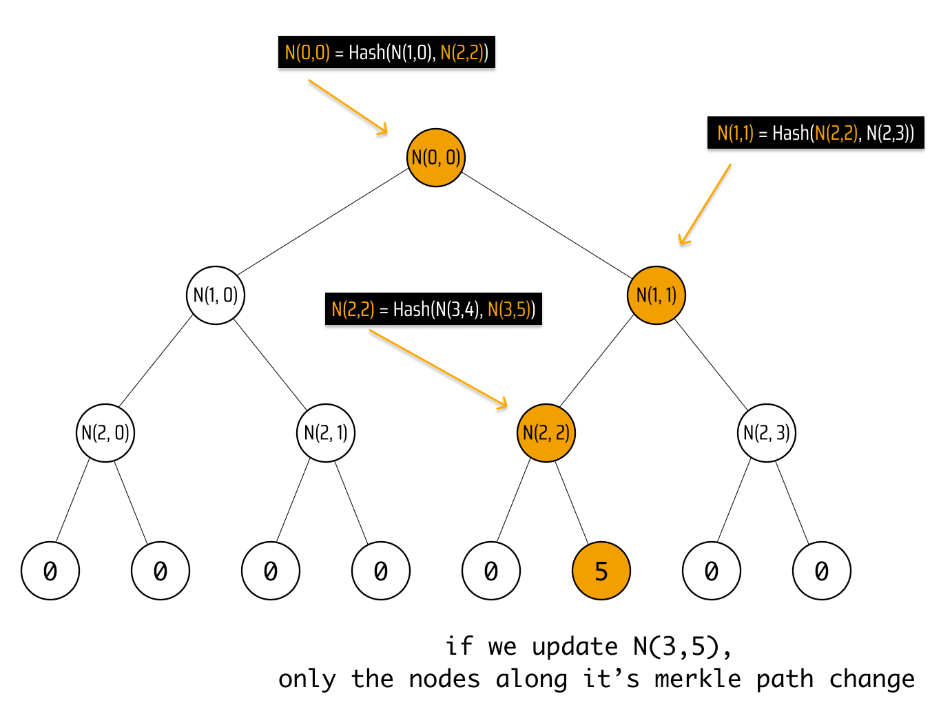 In the previous installment of our series, we already proved that, when you update a leaf in a merkle tree, only the nodes alone the leaf’s merkle path will change :