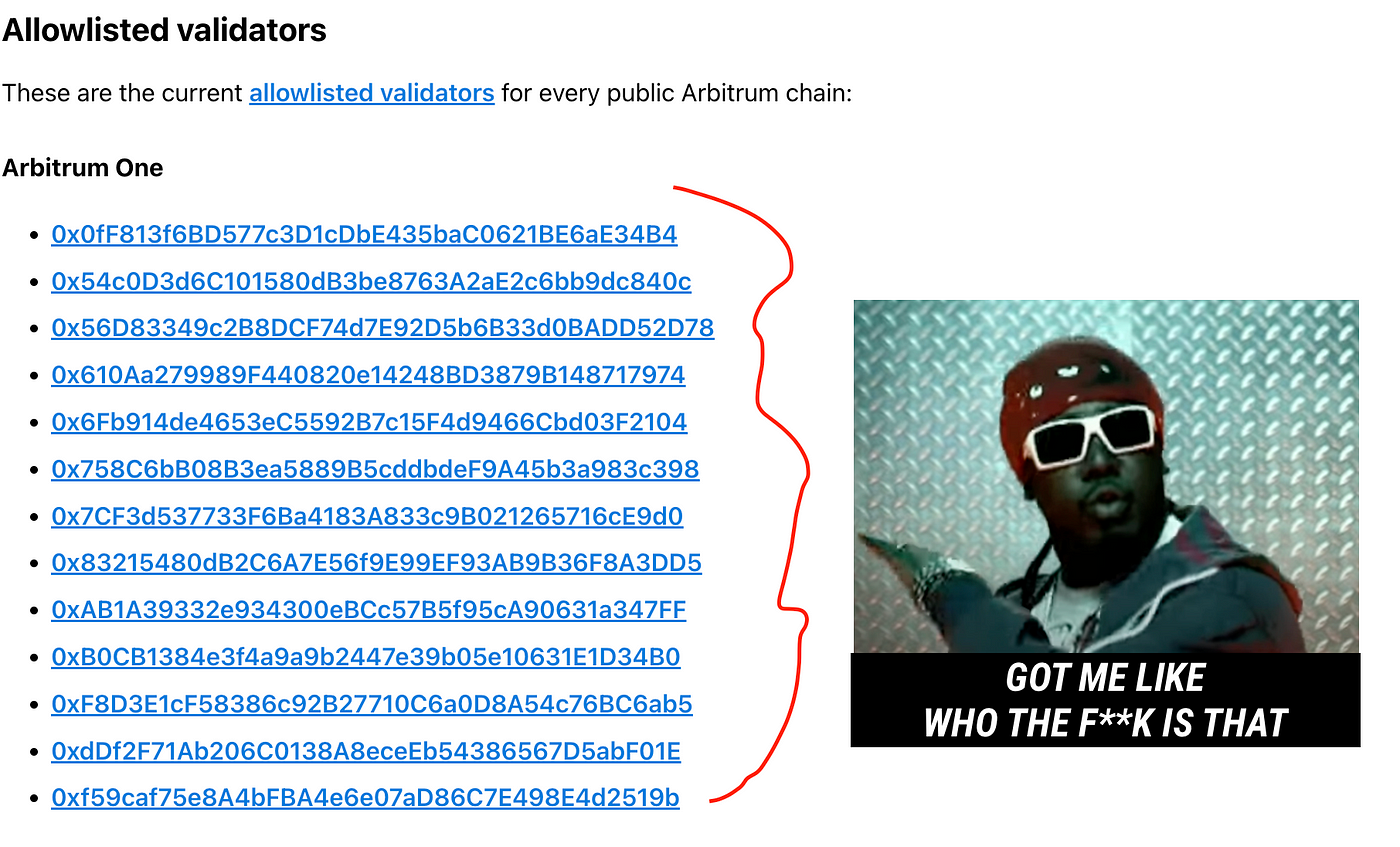 A helpful list of the defensive validators selected by the Arbitrum internal team: https://docs\.arbitrum\.foundation/state\-of\-progressive\-decentralization\#arbitrum\-one