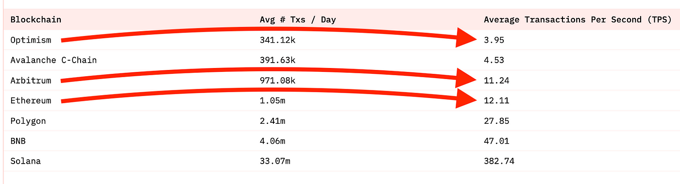 We now know the average TPS for Ethereum is 12.11, so we can also calculate the scaling factors for Aribtrum and Optimism: