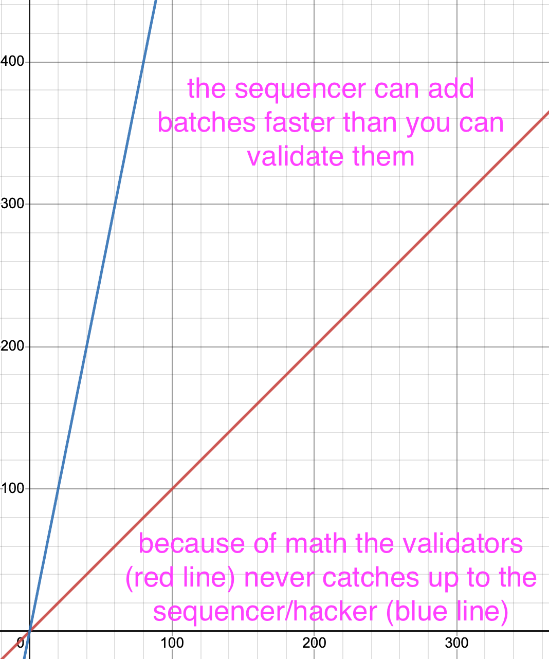 But, by the time the validators have derived and executed one batch of transactions posted on L1, the sequencer could have posted 5 more batches on chain.